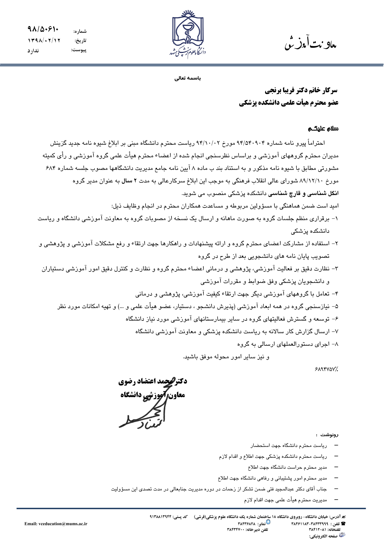 طی حکمی در تاریخ 98/02/12، سرکار خانم دکتر فریبا برنجی، استاد گروه انگل شناسی و قارچ شناسی به عنوان مدیر گروه معرفی شدند.